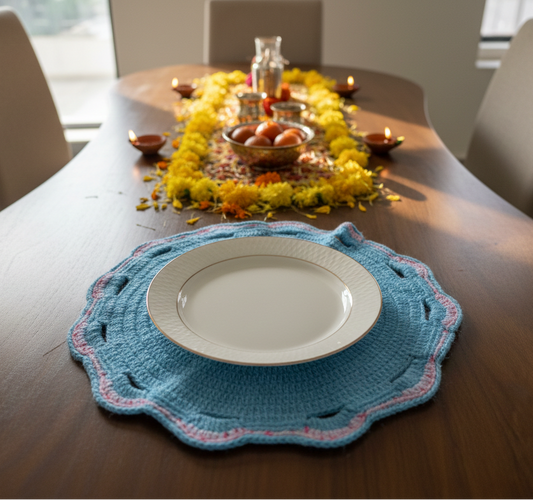 Versatile handmade crochet mats perfect for dining tables, pooja setups, centerpieces, and decorative home styling.