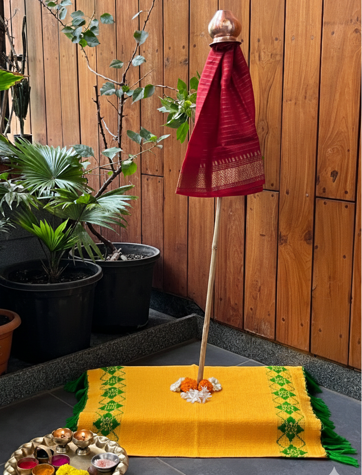 A bright yellow pooja asan designed to enhance the beauty of your prayer space.