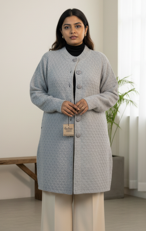 Wrap yourself in the timeless charm of this long grey woolen sweater, designed to balance sophistication and everyday comfort. The subtle textured knit and classic round neckline make it a versatile piece that pairs beautifully with both casual outfits and formal layering. With its long-line silhouette and button closure, this sweater flatters all body types while keeping you cozy through the colder days.