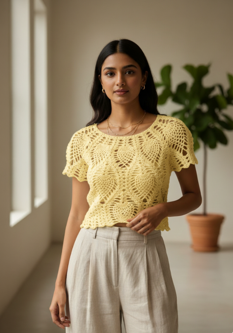 Elegant and timeless, the Sunshine Crochet Top Top is handcrafted with delicate crochet detailing for a breezy yet stylish look. Soft, lightweight, and versatile, it pairs beautifully with jeans, skirts, or layered over dresses — perfect for casual outings, beach days, or festive occasions.