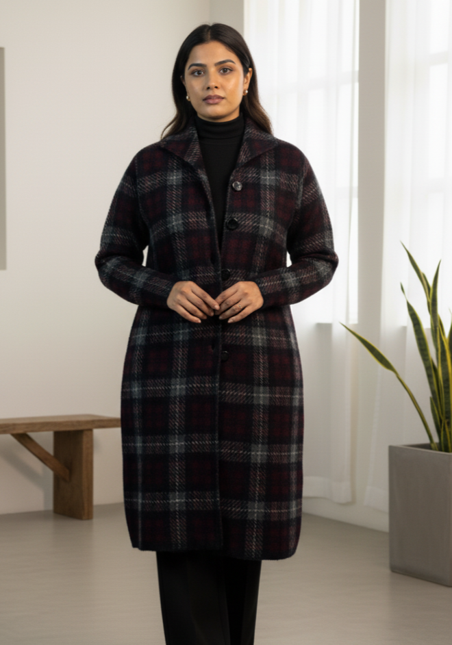 Stay warm in style and sophistication with this long woolen sweater, featuring a bold maroon and black plaid pattern. Designed with a structured collar and full-length silhouette, it offers both coverage and elegance, making it a versatile winter wardrobe essential. Whether layered over dresses or paired with trousers, this piece blends effortless grace with cozy warmth for all occasions.