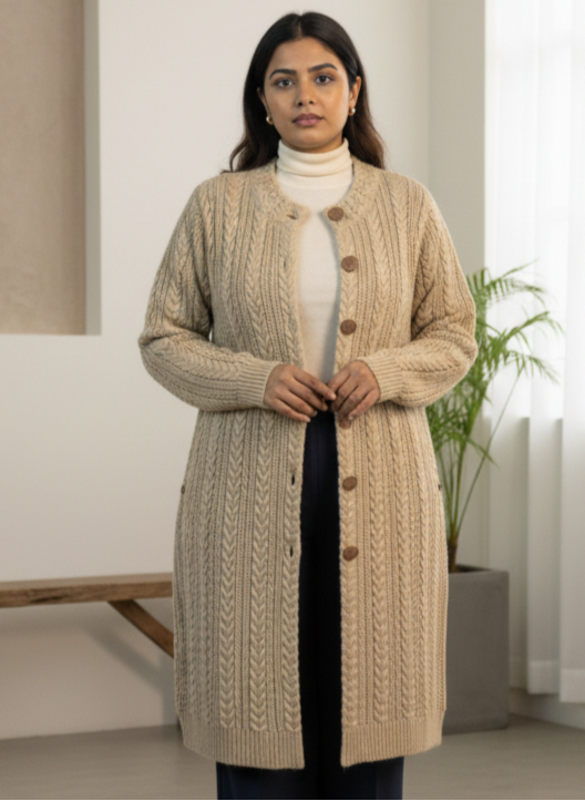 Wrap yourself in warmth and elegance with this timeless beige long woolen sweater. Featuring a detailed cable-knit design and a button-down front, it blends classic sophistication with modern comfort. The neutral tone makes it a versatile piece — perfect for layering over both casual outfits and formal ensembles during colder seasons.