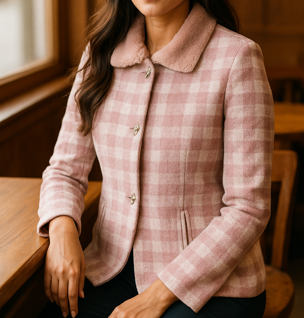 A sweet blend of charm and warmth — this checkered pink woollen coat features a plush faux fur collar for that extra cozy touch. Soft, structured, and perfect for chilly days, it’s your go-to for elevated winter layering.
